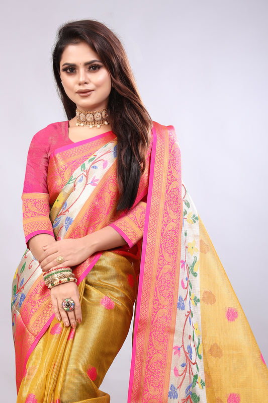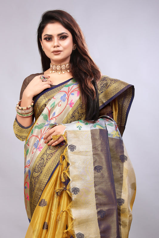 Delightful Exclusive Attractive Designer Bollywood Saree For Women Soft Lichi Silk saree with Rich Pallu & Meenakari with Weaving Border ( Gold Chaki - Yellow )